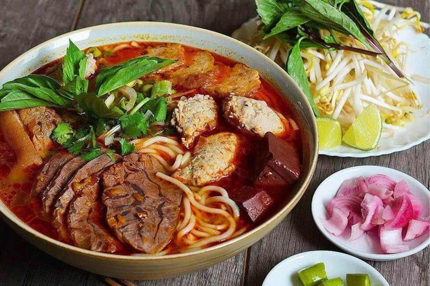 The dish includes beef, pork, and sometimes blood sausage, providing varied textures and flavors. Fresh herbs, lime, and vegetables are available for customization. The combination creates satisfying spicy meals popular for breakfast and lunch. Street vendors and restaurants throughout Hue serve bun bo with varying levels of spice, depending on the dish.