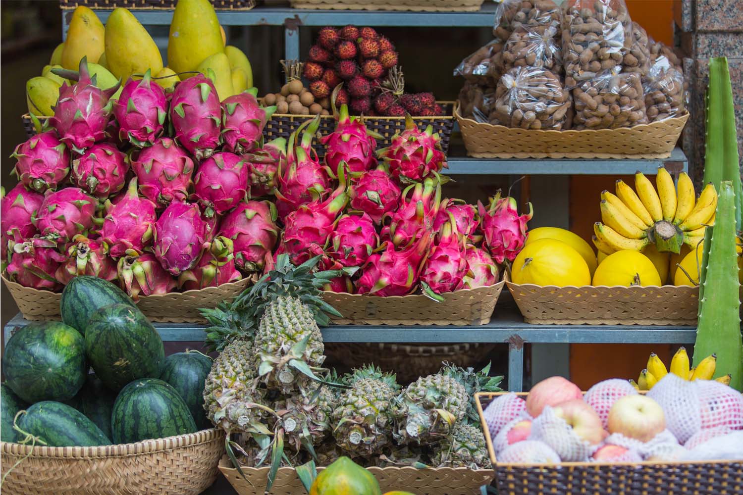 Fruit varieties shift throughout the year. Mangoes, rambutan, durian, longan, and dragon fruit appear at different times depending on region and climate.