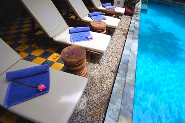 Consists of Khmer style Villas and Suites around a lovely pool .The Boutique Resort is designed in a modern Asian style with all luxuries and the addition of locally crafted furniture sourced from sustainably-harvested palm wood, modular terrazzo surfaces, vibrant Asian art, Cambodian crafted silks, secluded balconies, alfresco private stone bathtubs and local tiles floors