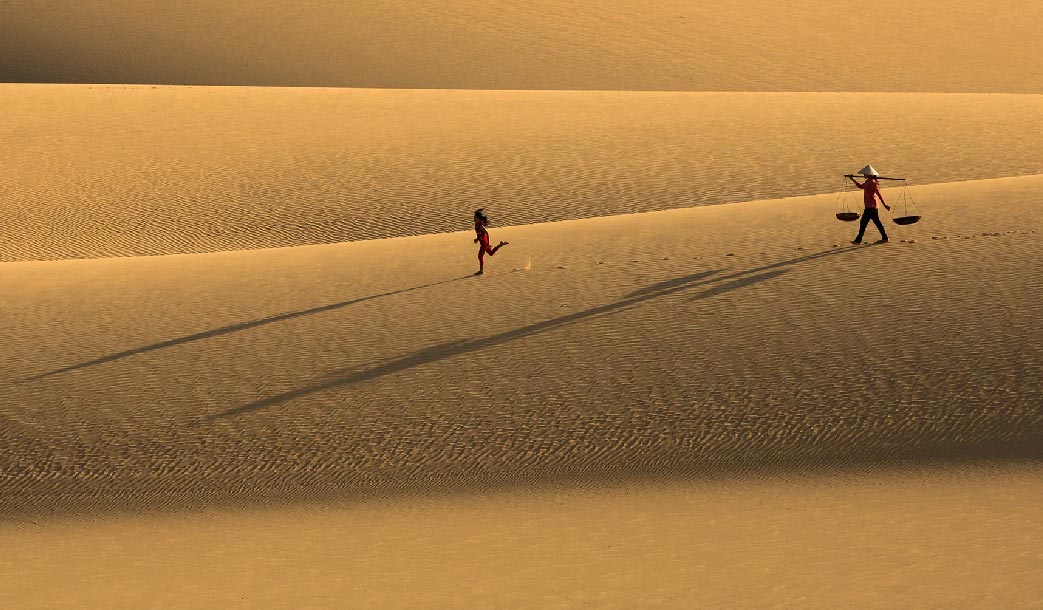 The afternoon timing at the white dunes is deliberate. Earlier in the day the light is flat; in the mid-to-late afternoon, the low sun casts shadows across every ridge and hollow, and the sand shifts from blinding white to warm gold. The dunes at Bau Trang (White Lake) are the largest in the area — wide open hills of fine white sand with a lotus lake at the base and open sky in every direction.