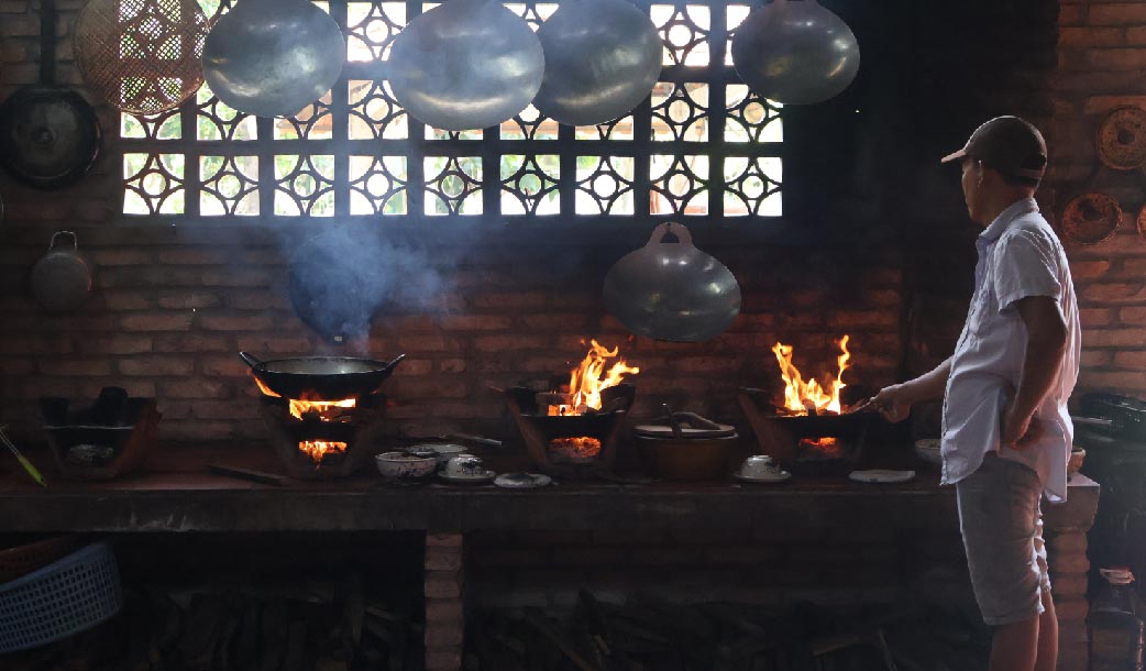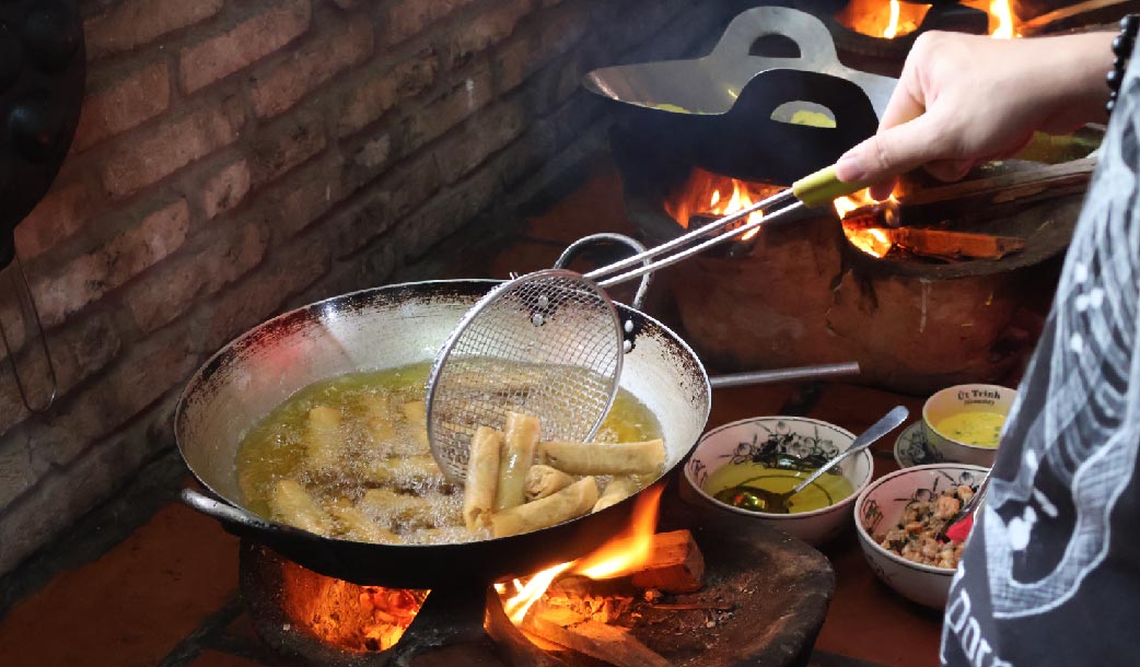 Guests join members of the host family in the kitchen to prepare dinner. The cooking session is not a demonstration — guests work alongside the family, preparing actual dishes for the table. Typical dishes include cá kho tộ (catfish braised in a clay pot with caramel, fish sauce, and black pepper), rau muống xào tỏi (stir-fried water morning glory with garlic), and gỏi cuốn (fresh spring rolls assembled at the table with herbs, river shrimp, and rice paper). The host family members eat dinner with the guests. The conversation — mediated by the guide — typically covers life on the island, the family’s history, and the changes the delta has experienced over recent generations.