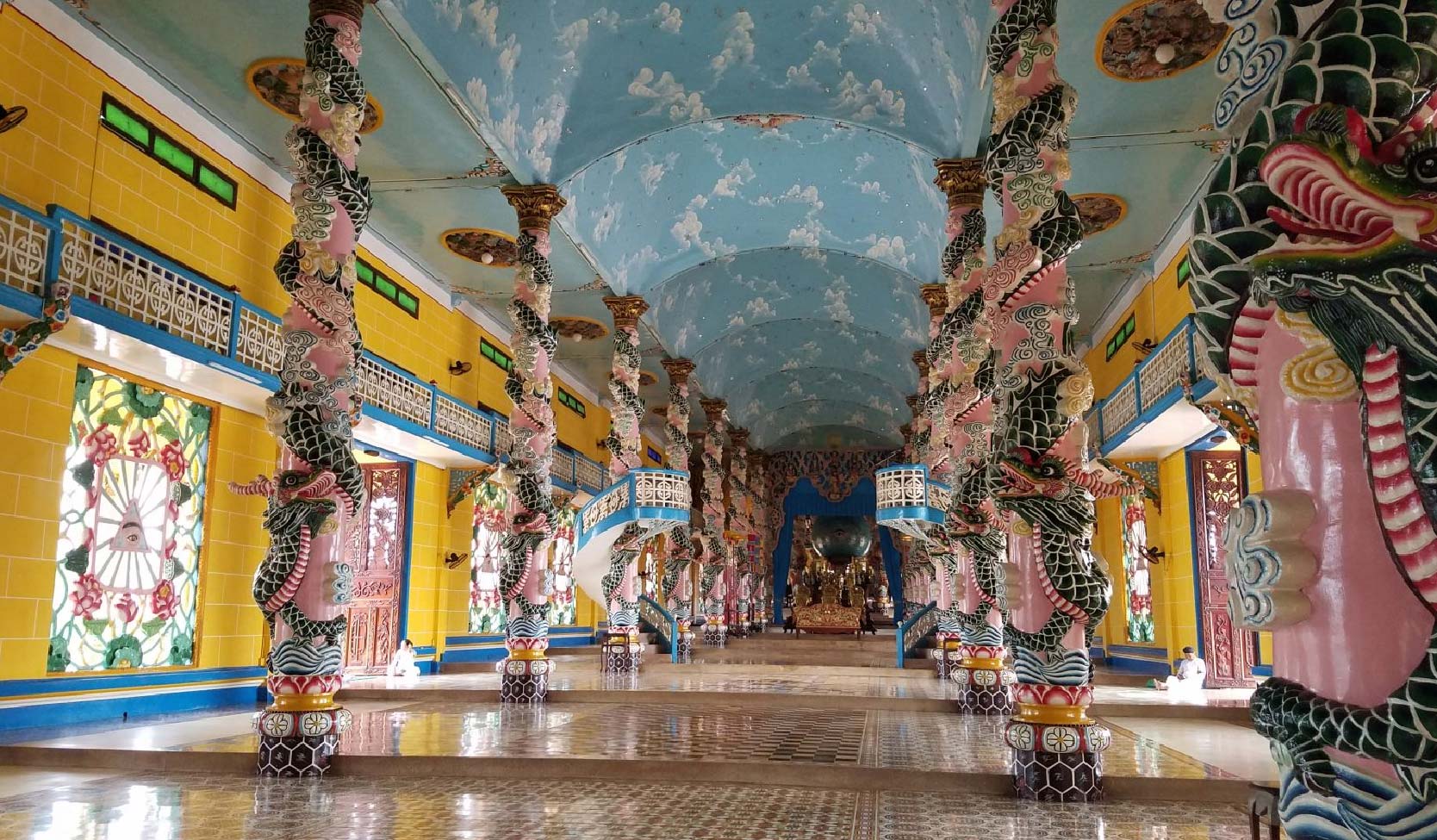The interior functions as an active place of worship, not a museum. Followers are present throughout the day. The guide explains the theology of each element — the Divine Eye, the yin-yang motifs, the column dragons, the colour coding of the clergy robes (yellow for Buddhism, blue for Taoism, red for Confucianism) — in the context of a living religion with over four million adherents in Vietnam today.