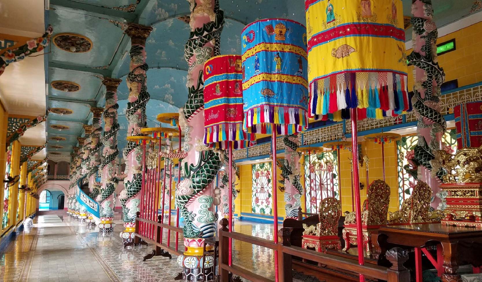 Inside, the nave is divided into columns painted to resemble blue-scaled dragons coiling upward to a vaulted ceiling decorated with clouds and stars — a representation of the heavens. At the altar end, a large blue globe bearing the Divine Eye occupies the focal point of the space. Statues of the three ‘saints’ of Caođàism — the Chinese poet Lý Thái Bạch, the Vietnamese poet Nguyễn Bỉnh Khiêm, and Victor Hugo — stand together, representing the Third Amnesty of God, in which God communicates through human creative and moral achievement rather than through a single prophet.