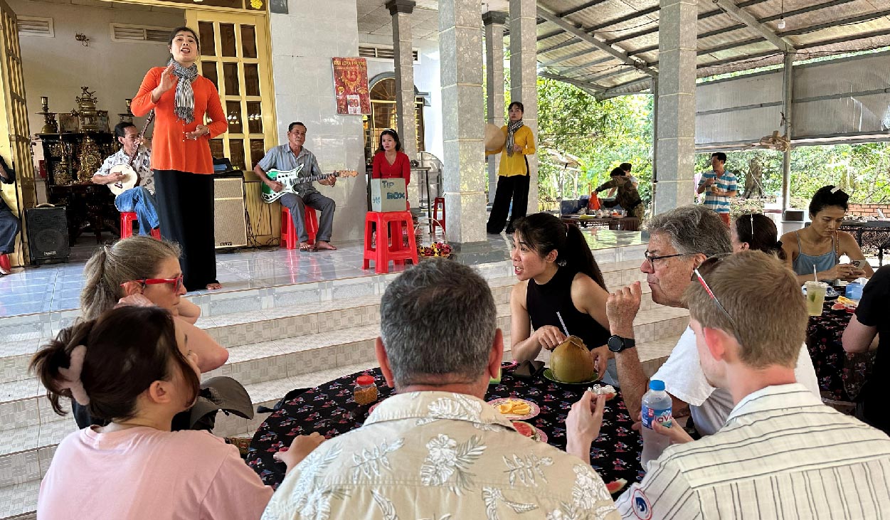 Settle in for a live performance of đờn ca tài tử — Southern Vietnamese chamber folk music, inscribed on UNESCO's Intangible Cultural Heritage list. Local musicians play the đàn tranh (16-string zither), đàn kim (moon lute), and đàn bầu (monochord). The music is unhurried and expressive — a good reflection of the delta itself.
