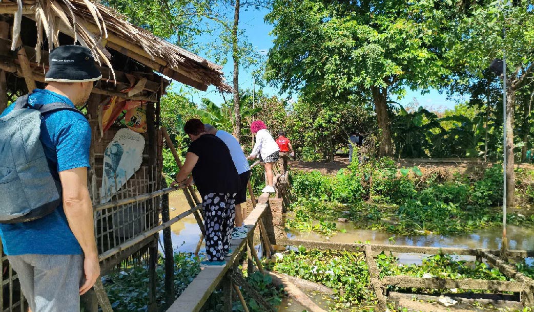 Sampan ride (approx. 30 min): A local rower takes you through back canals too narrow for any motor. Coconut palms overhead, stilted houses on both sides. •