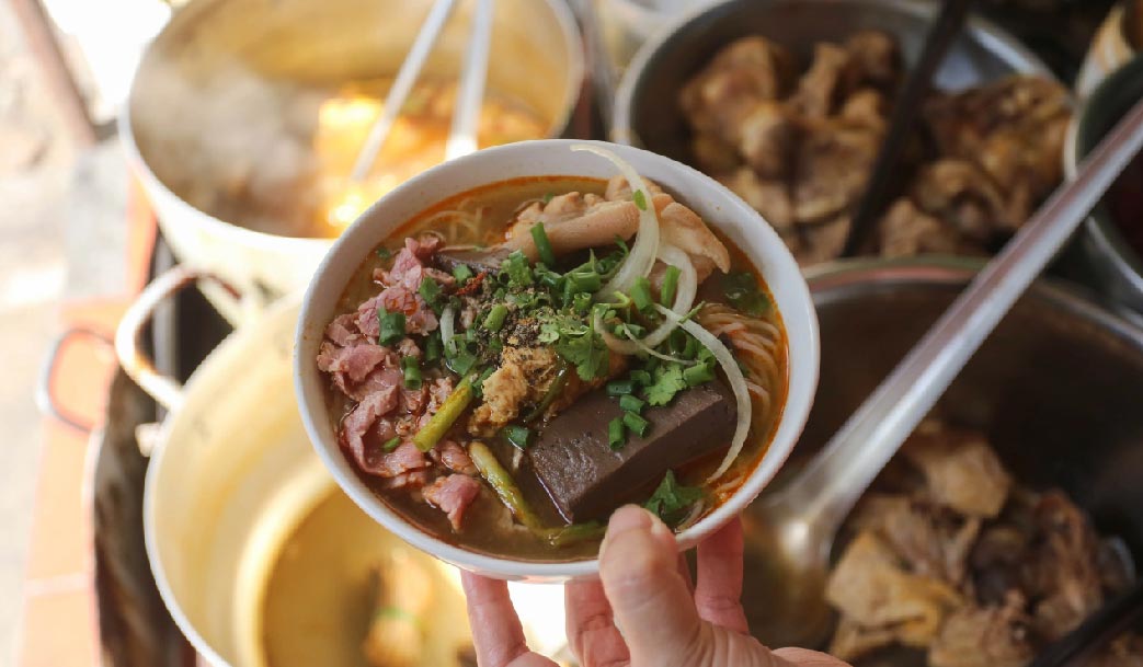 The first proper stop is a neighbourhood phở stall — the kind with two or three tables on the footpath, a giant pot that’s been on the fire since 4 AM, and a queue of regulars at the end of the working day. You’ll get a bowl of phở bò (beef noodle soup) with your choice of cuts, a plate of fresh herbs, bean sprouts, and a squeeze of lime.