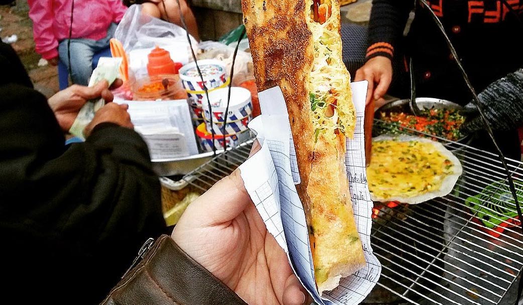 Bánh xèo is a southern Vietnamese dish that doesn’t travel well — it needs to be eaten within about two minutes of leaving the pan, which is why you can only really have it at a proper stall. The name means “sizzling cake”: a large rice-flour and turmeric crepe, cooked in a very hot wok with pork, prawn, and bean sprouts until the edges are crisp and the centre is just set.