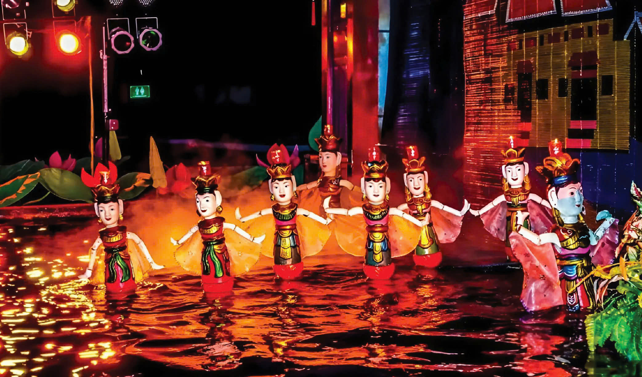 Check-in and relaxation time to recover from journey followed by traditional Vietnamese water puppet show - unique art form dating back centuries showcasing Vietnamese folklore and history.